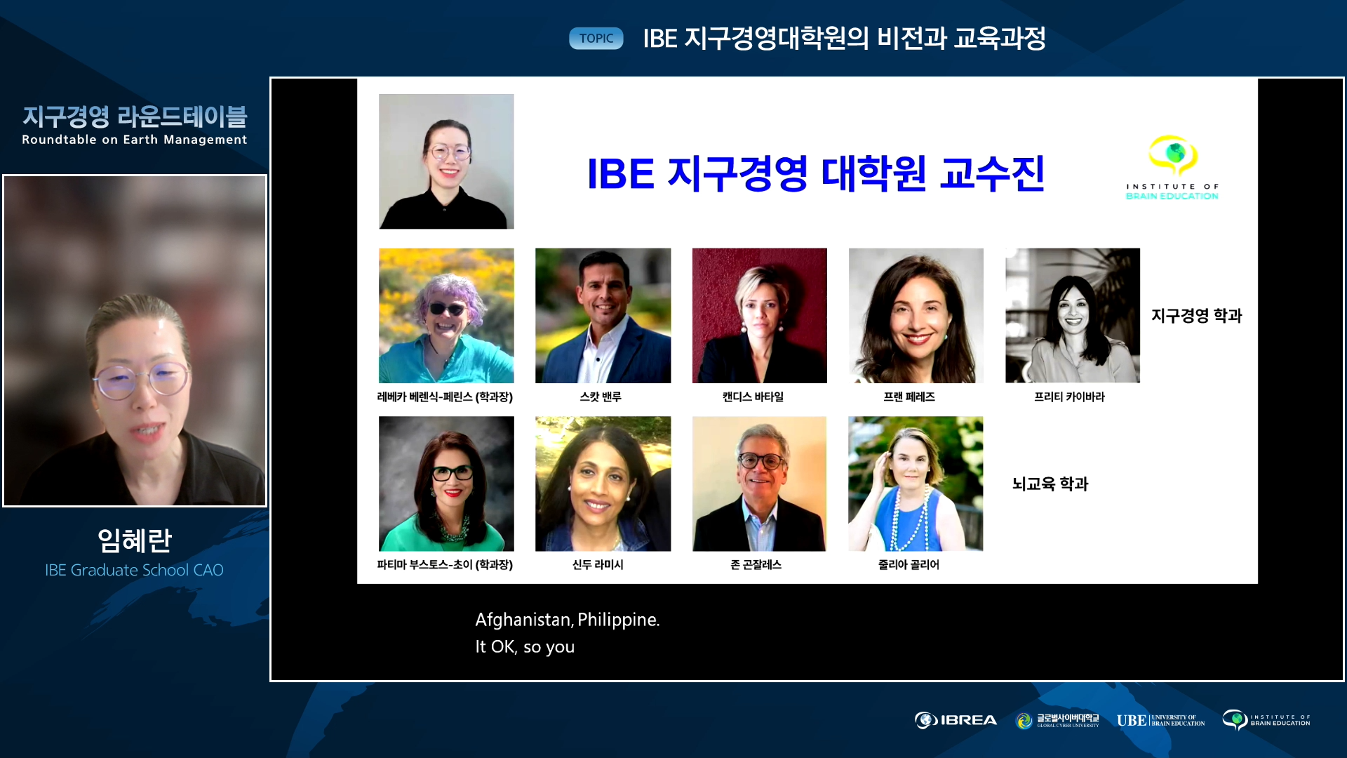 임혜란 IBE 지구경영대학원 CAO는 2023년 개설된 100% 온라인 석사과정을 소개하며, “뇌 기반 교육과정을 통해 전인적 웰빙, 리더십, 지속가능성의 변혁적 발전을 목표로 한다”고 설명했습니다. 뇌교육 체험 및 지도 경험이 있으면서 전문적 배경을 갖춘 교수진을 초청해 이론과 실천을 겸비한 교육을 제공하고 캡스톤 프로젝트를 통해 실천적 역량을 기르는 것이 특징입니다.