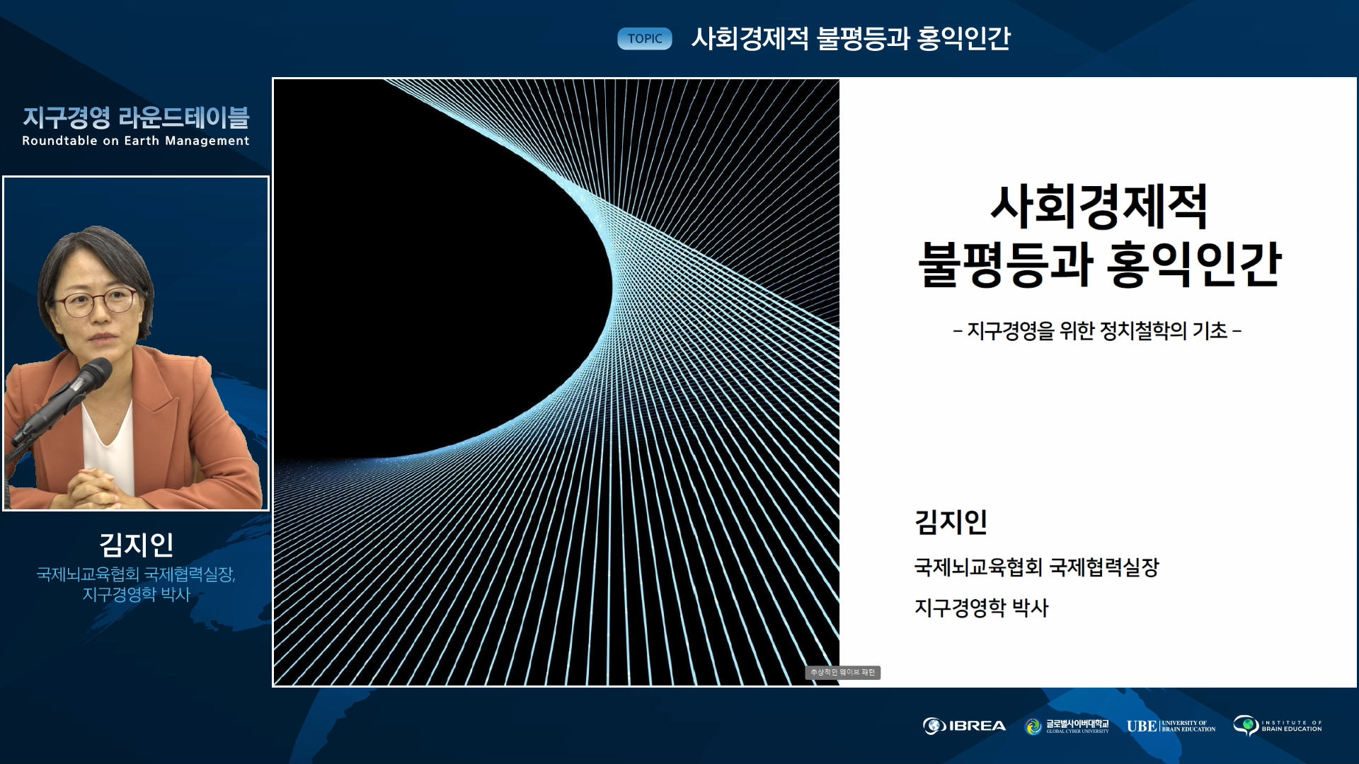 김지인 국제뇌교육협회 국제협력실장(지구경영학 박사)는 ‘사회경제적 불평등과 홍익인간’을 주제로 발표하며, 사회경제적 불평등이 심화될 수 밖에 없는 자유민주주의의 내재적 한계를 분석하고 홍익인간사상에서 신 국가로서의 대한민국의 정치사상을 정립한 조소앙의 삼균주의와 안재홍의 신민주주의를 통해 지구경영을 위한 새로운 정치철학의 방향을 제시했습니다.